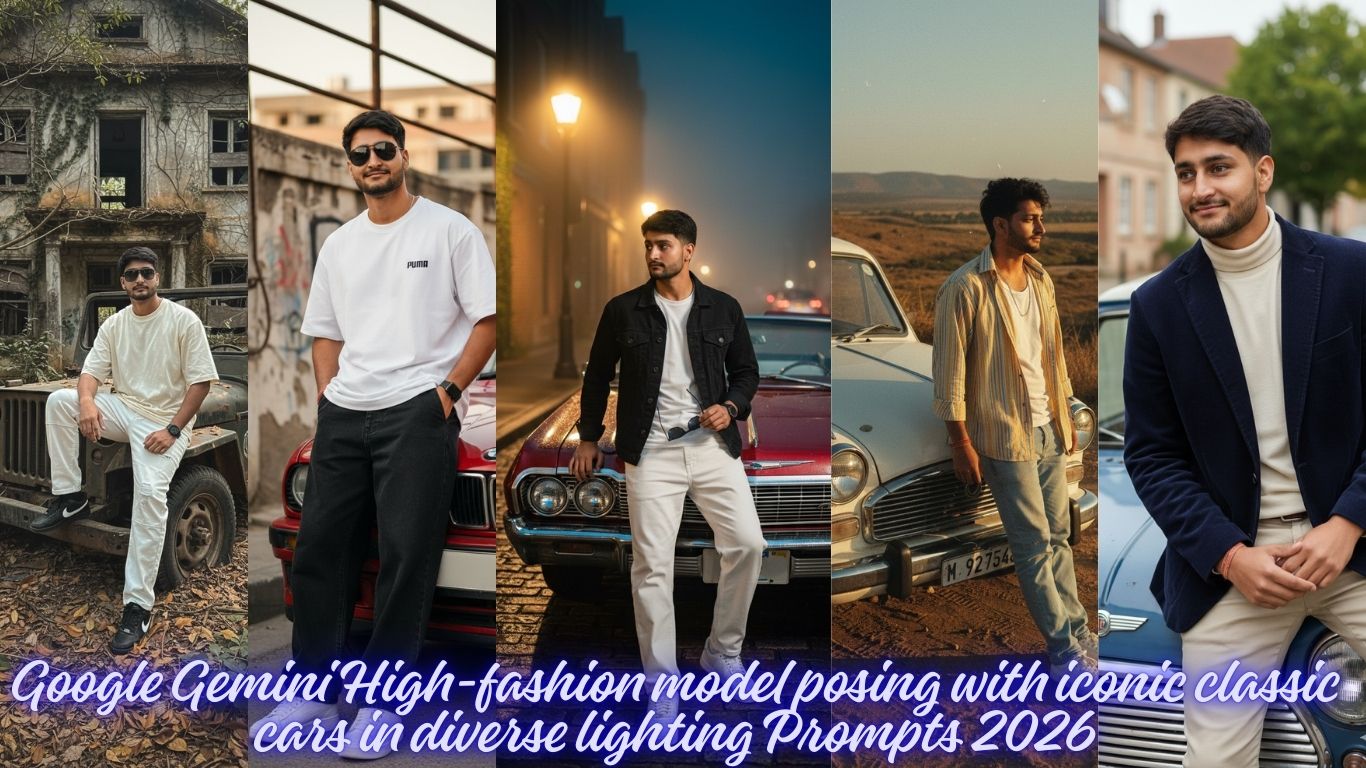 Google Gemini High-fashion model posing with iconic classic cars in diverse lighting Prompts 2026