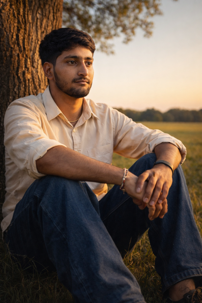 Create a 9.16 Portrait A person in Beige shirt and dark blue beggy jeans sits calmly under a large tree in a grassy field, arms resting on knees, lost in thought. Golden hour lighting, clear sky, distant tree line. Peaceful, reflective mood. 8K DSLR quality, natural shadows, cinematic depth, aspect ratio 9.16. Perfect for solitude, nature, and emotional storytelling. And for boy use my same face 100%