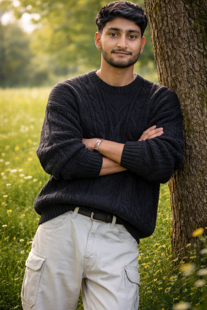 Create a 9.16 Portrait A hyper-realistic cinematic based on the uploaded image, keeping the same face and hairstyle of A young man standing outdoors in a lush green field filled with scattered yellow and white wildflowers, leaning casually against a tree trunk with arms crossed and a soft, confident smile. He wears a oversized black cable-knit sweater with visible texture and white beggy 6 pocket jeans. And for boy use my same face 100%