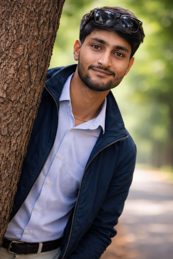 Create a 9.16 Portrait Ultra-realistic portrait of a young Indian man peeking from behind a large tree trunk, face must exactly match the uploaded reference image, same facial features, beard style, same lips, skin tone and expression.Casual outdoor photoshoot on a quiet road with lush green blurred background, natural daylight, soft bokeh, shallow depth of field. Wearing a dark blue jacket, short styled hair slightly messy and wearing black sunglass, warm confident smile, cinematic composition, DSLR quality, 8K ultra-HD, highly detail. And for boy use my same face 100%