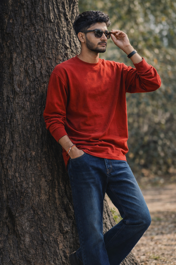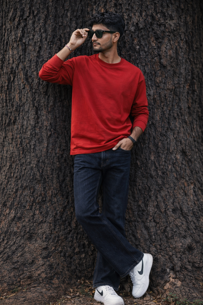 Create a 9.16 Portrait A hyper-realistic, full-body portrait of a stylish 22 Year-Old slim fit boy(keep it real face from the uploaded image) leaning casually against the rugged bark of a massive, dark tree trunk. He is captured in profile, And weraing trendy outfit red overzied full sleeve tshirt and dark blue bootcut jeans. looking to the side, with one hand raised adjusting his dark sunglasses. He has dark styled well settled short voluminous hair with faded sides. And for boy use my same face 100%