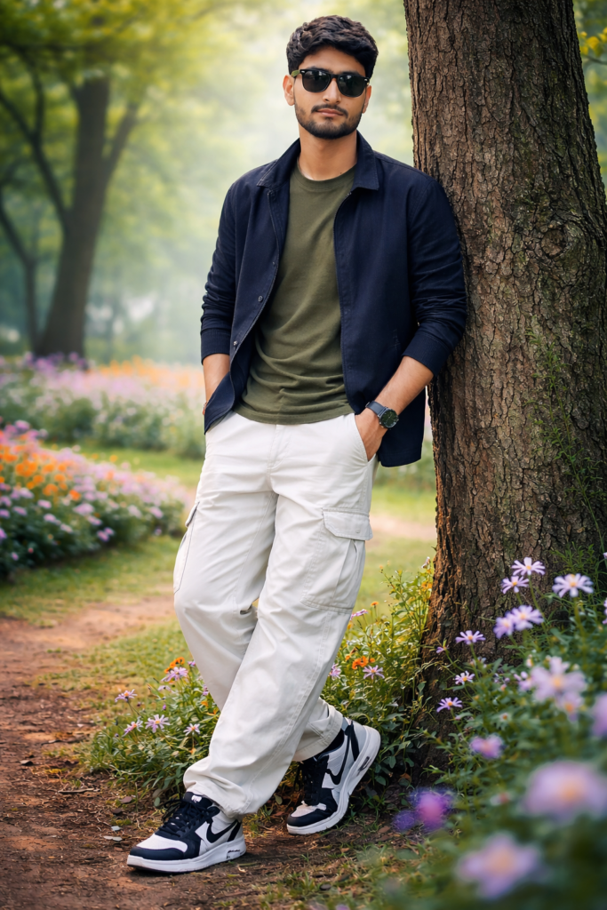 Create a 9.16 Portrait A professional full-body shot of a young boy leaning casually against a tree trunk, ethereal Flower park. He is wearing a long-sleeved olive green crewneck t-shirt and dark blue jacket, white 6 pocket beggy jeans, and clean black and white nike sneakers. He is wearing black matte sunglasses and a black watch. The background features lush, green trees and soft flowers in a misty, out-of-focus garden. Cool cinematic color grading, high detail, and a calm, stylish atmospher. And for boy use my same face 100%