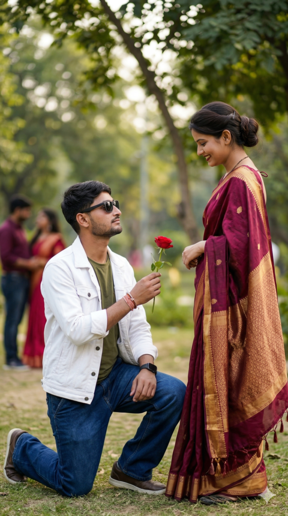 Create a 9.16 ratio portrait Ultra-realistic 8K HD photo of a romantic couple in the same pose and same mood as the reference. The boy is kneeling on one knee holding a red rose, wearing a whiite jacket over a olive green T-shirt and dark blue beggy jeans and wearing black matte sunglass. The girl is standing, slightly turned toward him, wearing a beautiful traditional saree with elegant draping, and looking at the flower in the boy’s hand. Background is a softly blurred outdoor park with gentle natural light. Hair set, Emotional, sad, cinematic atmosphere with HD clarity. And for boy use my same face 100%