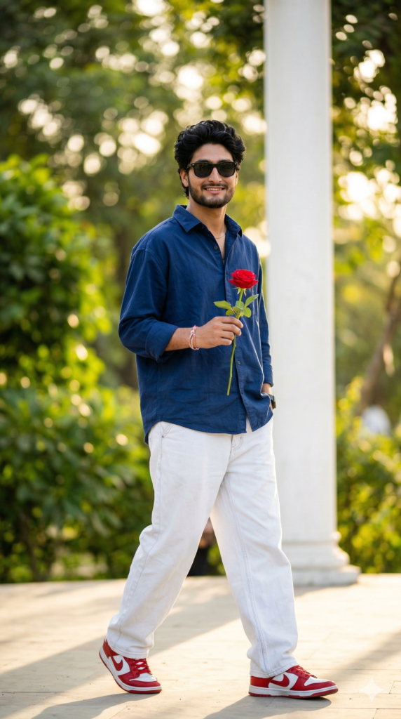 Create a 9.16 ratio portrait Give the exact same face 8k ultral image Cinematic medium shot of uploaded person with thick, wavy black hair, smiling warmly. He wears a dark blue oversized collored shirt and white baggy loose jeans and red and white nike snekears. He walking slowly, holding a single vibrant red rose in sharp focus, Sunlit park background with soft bokeh greenery and a white pillar. Natural pure greeny hour lighting, high detail, romantic and friendly atmosphere. And for boy use my same face 100%