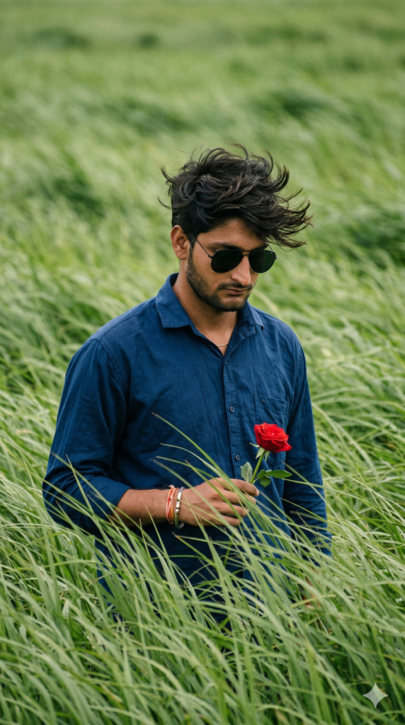 Create a 9.16 ratio portrait Use the attached photo to create a cinematic editorial portrait of a man, wind-swept green grass fields. Tall grass moves like ocean waves, partially obscuring him. He wears a loose dark blue shirt and wearing black sunglass, holding a single Red rose. Messy dark hair blows in wind, head tilted down, calm melancholic mood. Vertical 9:16, telephoto look, shallow depth, film grain, atmospheric, poetic, no text, award-winning imagery. And for boy use my same face 100%