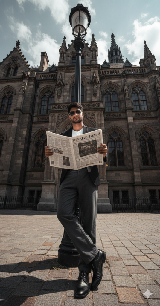 A hyper-realistic editorial street fashion photograph of a male supermodel holding an oversized newspaper in front of him, leaning casually against a black lamp post on a stone-paved sidewalk in front of a grand and majestic neo-gothic European building with details ornate spires and arched windows. Outfit blazer and loose pant formal shues wearing sunglass.Shot from a dramatic extreme low-angle ground-level wide-angle perspective, the camera looks upward emphasizing. Use my same face 100%