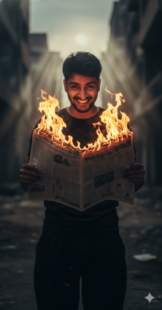 Ultra-realistic cinematic portrait of a young Indian man standing full-body, centered in frame, holding an open newspaper directly in front of his chest with both hands; the newspaper is actively engulfed in bright, realistic orange-yellow flames rising upward, flames partially obscuring the center of his face while illuminating it. Outfit Black tshirt and loose pant. Facial expression: intense, unsettling wide grin with teeth visible, eyes openedwide and alert, pupils looking straight forward directly into the camera. Use my same face 100%