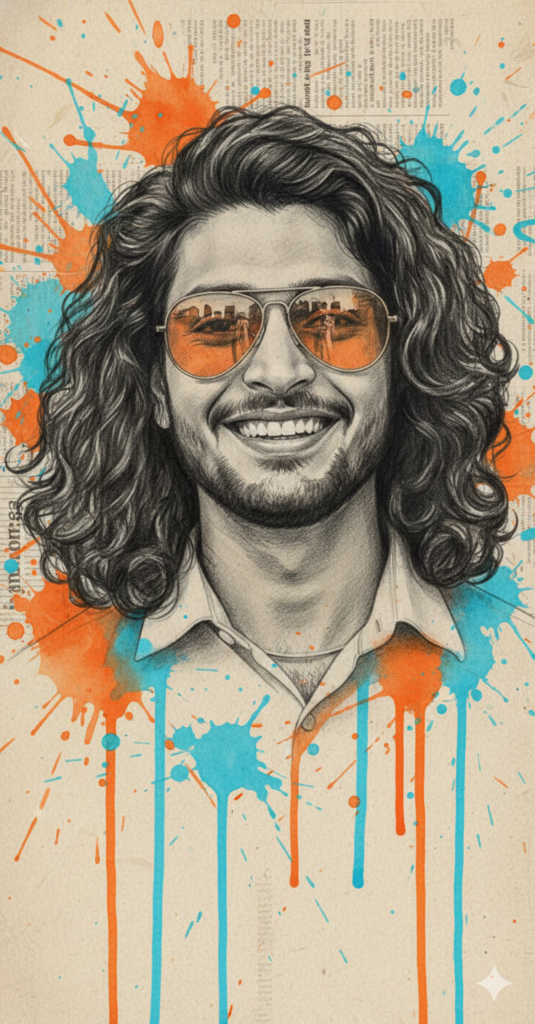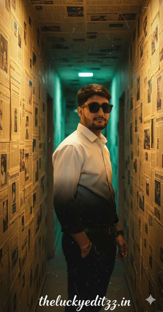 A moody, cinematic portrait of a young man standing in a narrow hallway covered with old newspaper clippings on the walls. He wears a back and white gradiant outfit or black pants and gazes back with a confident yet mysterious expression. The warm golden lighting contrasts with a soft teal glow in the background, and wearing sunglasses creating a nostalgic, film-like atmosphere. The text overlay in stylish handwritten script reads ''theluckyeditzz.in'', evoking the feel of a retro movie poster. Use my same face 100%