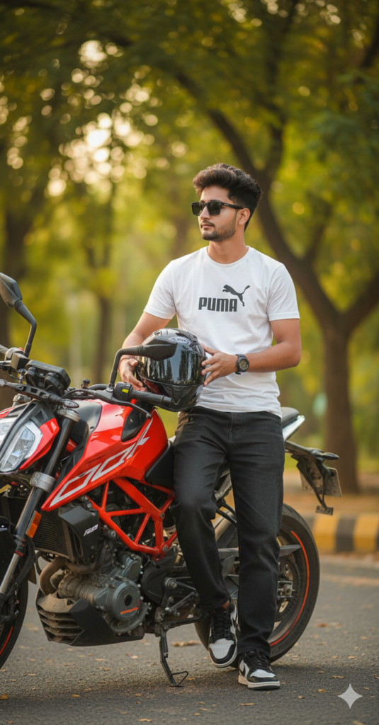 A high-quality lifestyle portrait of a young man/boy with voluminous, styled wavy dark hair, wearing a white puma t shirt and black baggy denim jeans. He is leaning casually against a vibrant red and black KTM Duke motorcycle. He is holding a glossy black full-face helmet resting on the fuel tank. The setting is outdoors during the golden hour, with soft, dappled sunlight filtering through lush green trees in the background. The shot is a medium full-length. and wearing matte sunglass and nike air jorden. Use my same face 100%