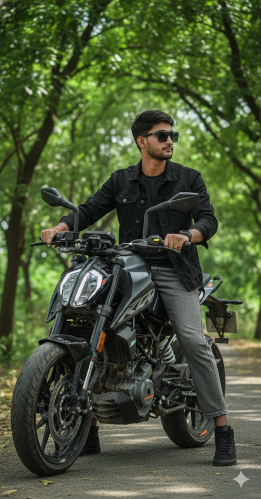 Ultra-realistic full-body shot of a stylish young mansitting confidently with a matte black KTM Duke 250 motorcycle under lush green trees. He has short black hair, matte sunglasses, black denim jacket over a T-shirt, baggy Grey beggy jeans, and leg on the ground, and other leg on brake orgear, looking to the right. The bike has bold wide tires, dynamic design like KTM Duke 250, black frame, anda KTM on the fuel tank. Use my same face 100%