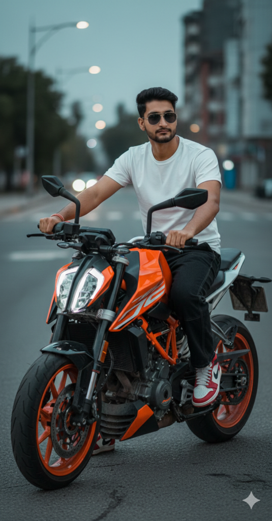 Create an ultra realistic, 8K resolution, high-detail cinematic image of a 20 years old handsome young man sitting on a ktm duke 790 bs6 motercycle on an empty street. Face with the face from the uploaded image, keeping the facial features exactly the same. and is wearing rimless sunglasses. He is dressed in a White wool t shirt with rolled-up sleeves, dark black Beggy jeans with visible seams and pocket detailing, and wearing nike air jorden sneakers with textured and watch. Use my same face 100%