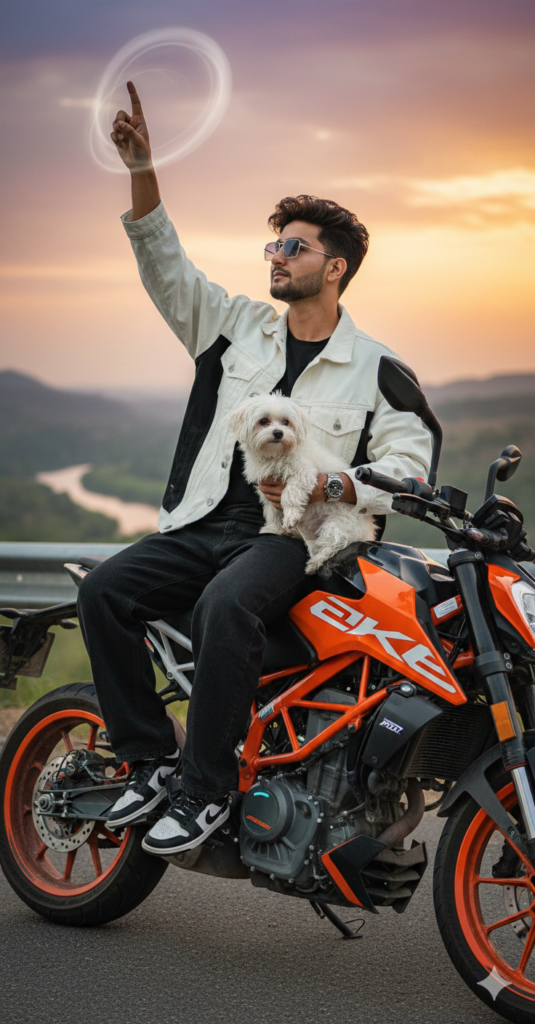 A man on the sit of a duke bike full bike.His left hand is placed on the sit, and he is holding a qwity white dog in his left hand. His right hand is raised towards the sky and he is swirling the hand with his one finger. He is wearing a white black overcolard open-button denim jacket, a black t-shirt, black denim beggy jeans, nike sneakers, rimless sunglasses, and a watch: Cinematic image, iPhone Pro 17 zoom camera quality, HD. only added voluminous hairstyle and fair face. Use my same face 100%