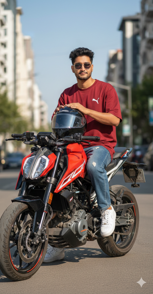 8k Hyper-realistic full body shot: me A 20 year old cool young boy, oversized Maroon puma shirt, Baggy Denim pants, and white nike sneakers, wearing rimless sunglass and slightly messy dark hair, sharp jawline, direct gaze,, his height is 5.8 feet. he sitting on a customized red and black ktm duke250 motorcycle. He is looking ahead. He has a glossy rider black helmet on the tank of the bike and he has placed his hands on it. The scene is outdoors. Sunny Photography. Use my same face 100%