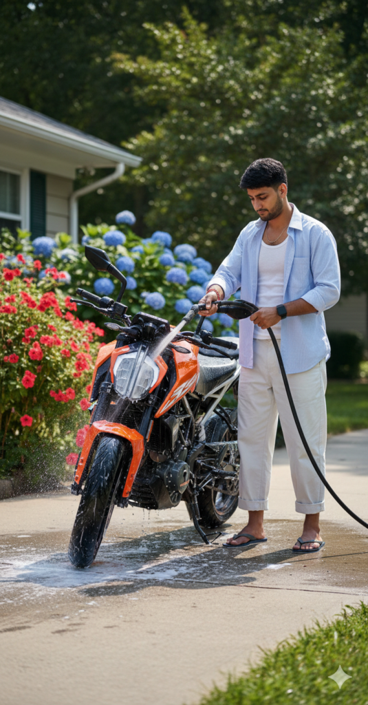 A 8k cinematic HD shot captured with an iPhone zoom camera, featuring the man from the reference image with a 100% facial match. He is washing a KTM Duke motorcycle with a water hose in the driveway of house. He is wearing a light blue button-down shirt left open over a white vest (undershirt), white oversized pants, and slippers. Nearby is a lush garden filled with vibrant red and blue flowers. High detail, natural lighting, realistic textures. Use my same face 100%