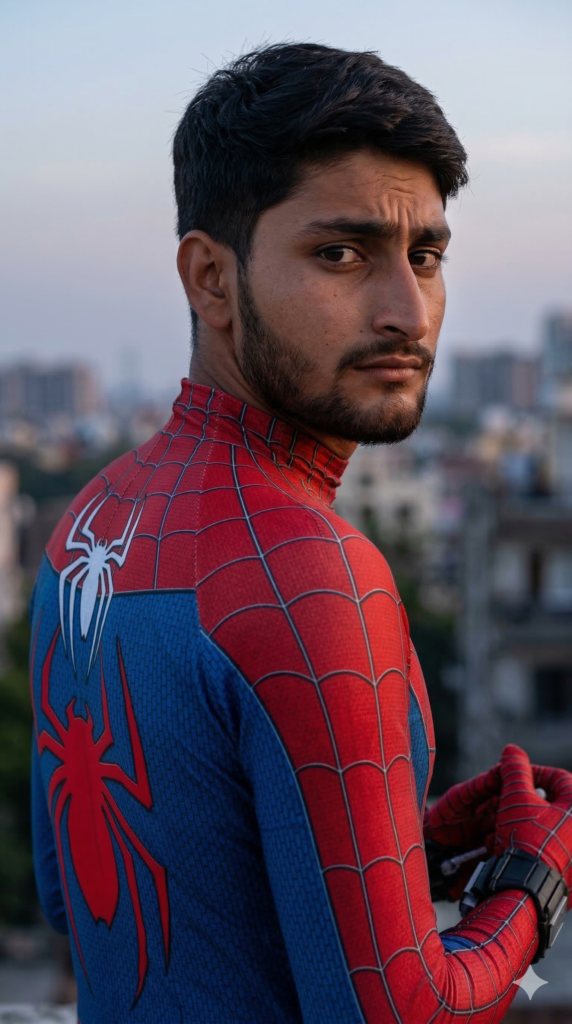Create A 9.16 portrait, A close-up shot a young man as Spider-Man, from the chest up, with his head turned slightly to look over his right shoulder. His expression is serious and contemplative, with a slight furrow in his brow. He is wearing the red and blue Spider-Man suit, visible white Spider logo on his back and shoulder, with the classic web pattern and a prominent red spider logo on the back. And for boy use my sane face 100%