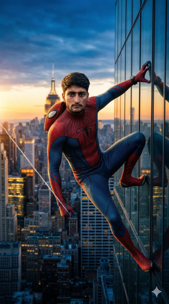 Create A 9.16 portrait, Cinematic ultra-realistic portrait of a man in Spider-Man suit hanging from the side of a tall skyscraper, mask removed showing his real face (Preserve Face 100%). The background shows a dramatic New York City skyline at sunset with glowing city lights, golden and blue tones, depth of field, highly detailed, realistic lighting, epic superhero atmosphere, aesthetic composition, cinematic vibe. Like DSLR photo, And for boy use my sane face 100%