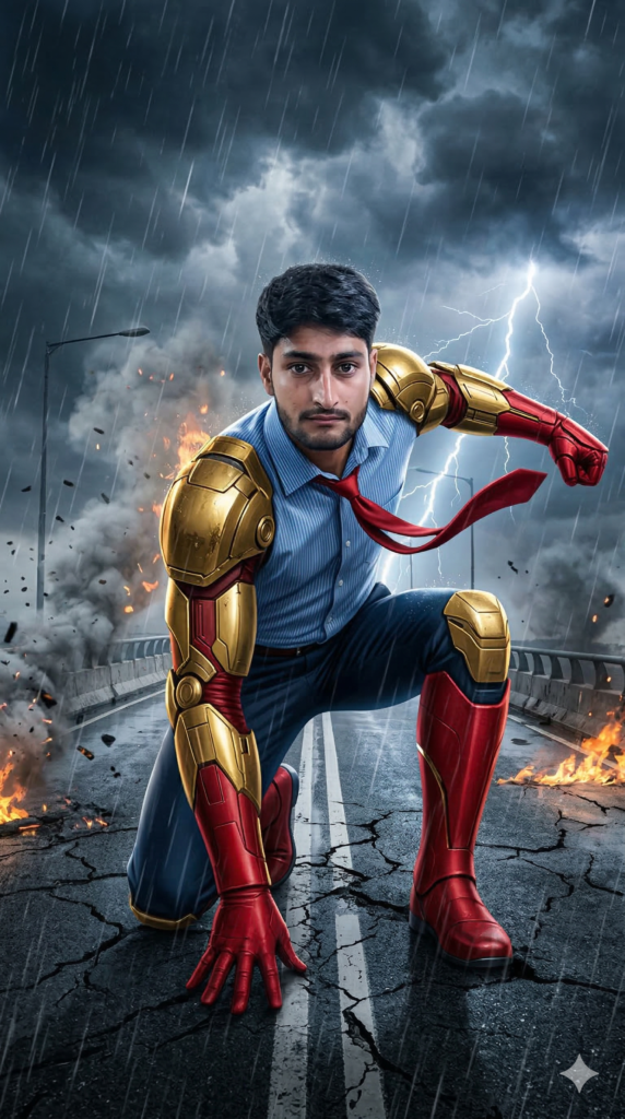 Create A 9.16 portrait, Cinematic superhero action scene on a destroyed highway bridge beneath stormy clouds. The same young man from the uploaded image — exact same face, no alteration whatsoever — crouches low in a heroic mid-pose, one knee bent and one hand pressed firmly against the cracked asphalt, as if bracing for impact. Wearing blue dress shirt ripples in the wind, tie whipping dynamically, and his red gloves and boots catch reflections from nearby flames. Golden mechanica, And for boy use my sane face 100%