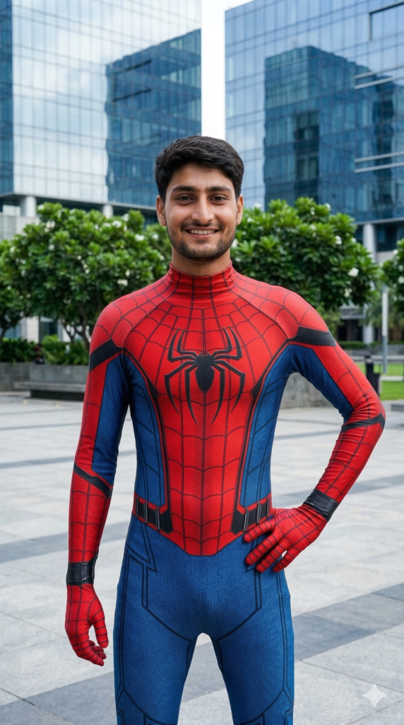 Create A 9.16 portrait, A full body shot of a smiling young man as Spider-Man, standing outdoors in front of a glass building and lush green foliage. He is wearing the red and blue Spider-Man suit from the Marvel Cinematic Universe, specifically the "Iron Spider" suit without the mechanical arms, featuring prominent black web lines and a black spider emblem on the chest. The suit is form-fitting, highlighting his athletic build. And for boy use my sane face 100%