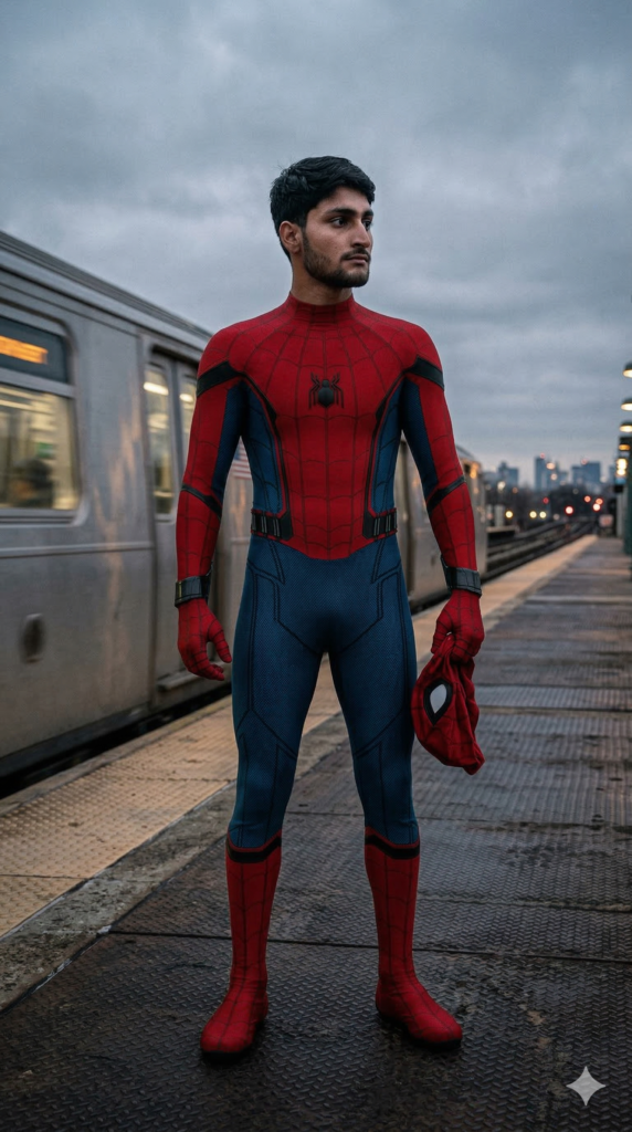 Create A 9.16 portrait, Cinematic superhero portrait. Full-body shot of MCU Spider-Man (from uploaded image) in his red and blue suit, standing on an elevated platform. He holds his mask in his gloved hand, looking intently right. Silver train passes behind him with motion blur. Overcast, bright white sky. Heroic pose, detailed costume, movie still quality and photo capture like DSLR 50mm Lens. And for boy use my sane face 100%