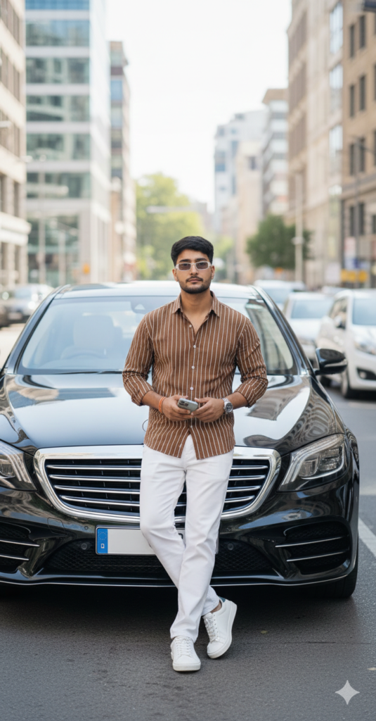 Full shot of me in an outfit of a brown striped long-sleeve button-down shirt with the sleeves rolled up, white pants, and white shoes. I'll be wearing sunglasses and a watch, holding a phone in one hand. The setting is outdoors, on a street with buildings and cars in the background, under bright daylight. I'll be leaning against a black car. I'll have one leg crossed over the other, with my arms relaxed. The lighting is natural and bright, as if taken on a sunny day and use my same face 100%