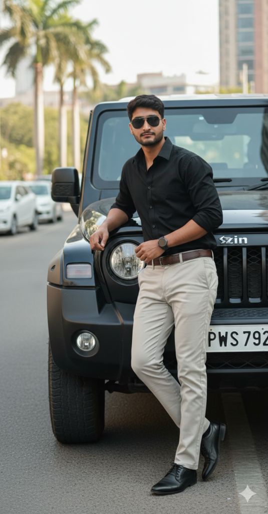 “Ultra-realistic street-style photograph of a stylish man posing confidently beside a rugged black SUV (Mahindra Thar). He is wearing a fitted black button-up shirt with sleeves rolled up, tucked into slim-fit beige trousers, paired with black formal shoes. He accessorizes with dark sunglasses and a smartwatch, giving a modern and sharp appearance. and voluminous hairstyle add to his fashionable look. The background features parked cars, palm trees, and an outdoor urban. and use my same face 100%