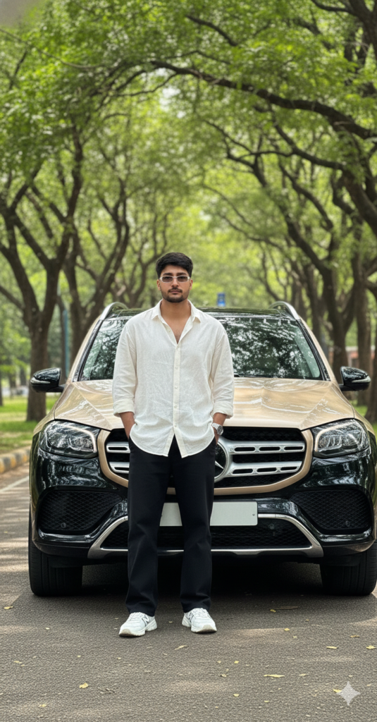 A 5'7" young man leaning casually with one hand on the hood of his Mercedes Maybach GLS 600d, facing slightly toward the camera. The front-right angle highlights the car's elegant two-tone finish champagne upper body and glossy black lower half glimmering under soft daylight filtered through lush green trees. He's wearing an off-white oversized linen shirt, black baggy jeans, and chunky New Balance sneakers. A silver luxury watch and frameless narrow sunglasses and use my same face dont change