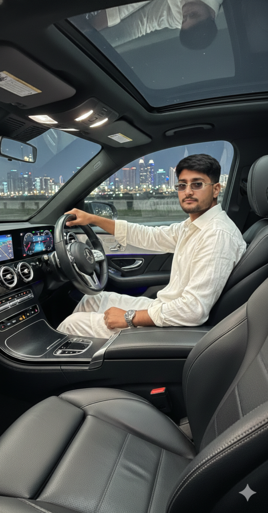 Ultra-realistic cinematic photo of [the person from the reference photo, keeping all facial features intact sitting in the driver’s seat of a mursedes car, viewed from behind the shoulder with one hand on the steering wheel. The person is white salwar kameez sunglasses, and a silver watch. The car’s interior is sleek and modern, look in front with leather seats and a panoramic sunroof, illuminated by natural nightlight. Islamabad City and use my same face 100%