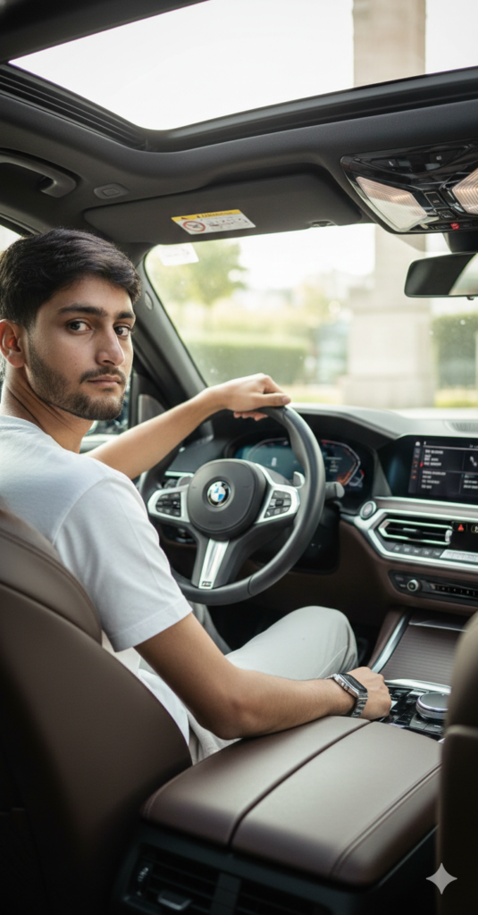 Ultra-realistic cinematic photo of [the 16 year thin and skinny body boy from the reference photo, keeping all facial features intact] sitting in the driver’s seat of a luxury BMW, viewed from behind the shoulder with one hand on the steering wheel. The boy is wearing a stylish white t-shirt, and a silver watch. The car’s interior is sleek and modern, with leather seats and a panoramic sunroof, illuminated by natural daylight.keep my face and hair 100% same as in the reference image