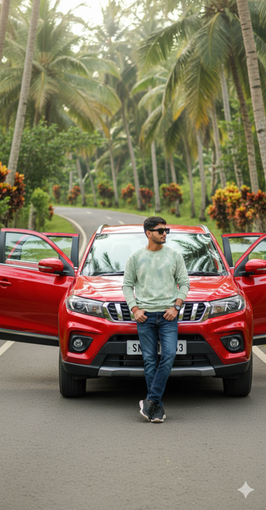 8k ultra image. A stylish young man in a lightgreen printed sweatshirt and dark jeans leans confidently against a vibrant red Maruti Suzuki Brezza He wears black sunglasses, looking away from the camera. The car's front doors are open in a lush, tropical setting with palm trees and greenery. Natural daylight illuminates the scene, capturing the sleek cardetails and the relaxed, cool aesthetic of the subject and use my same face 100%