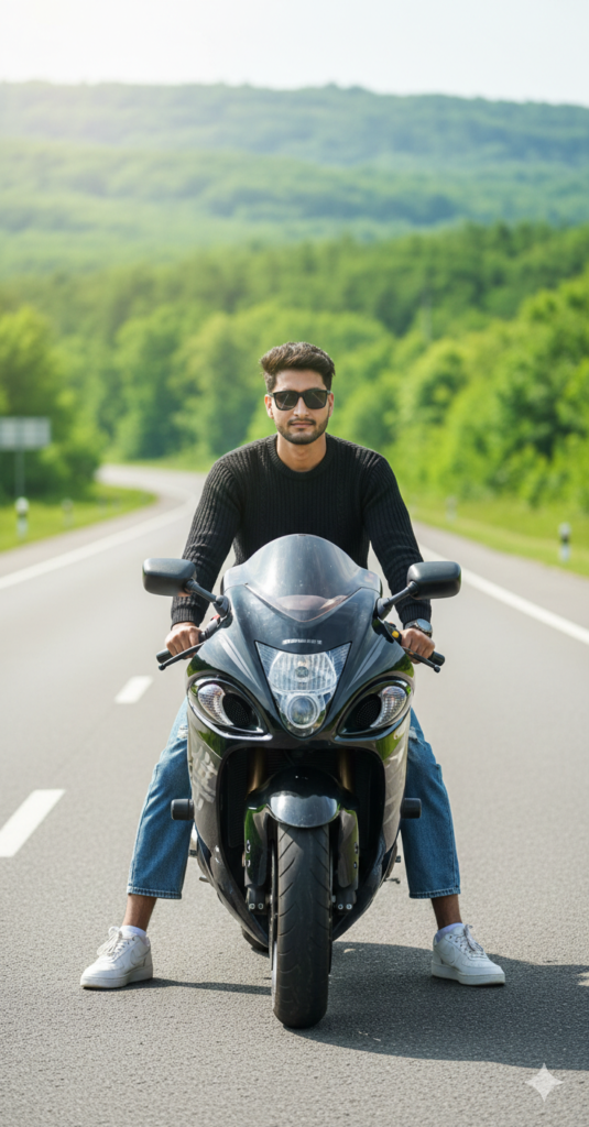 "8k ultra-realistic editorial photo of a young boy background A handsome boy sits stylishly in the middle of a Black Suzuki Hayabusa bike on highway with a green background around him. boy are looking at the camera. creating a dreamy, romantic, and lively atmosphere, Captured in a candid vibrant, and cinematic photography style with natural light and shallow, The boy is wearing black knite -sweater. with Loose blue jeans with nike Sneakers. Wear a matte sunglasses. Use my same face 100%