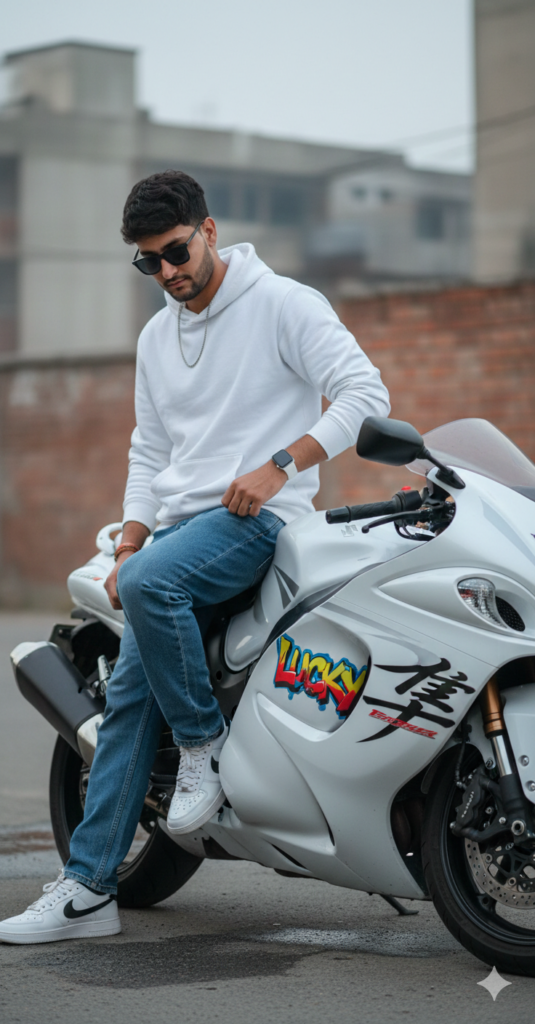Ultra realistic 8K cinematic portrait of a stylish young man with fair bright skin, late teens to early twenties, positioned slightly left of center,chain,white apple watch,matte sunglasses, He wears a white huddie, blue beggy jenas, nike sneakers.His short wavy hair and stubble beard frame a contemplative downward gaze.He leans casually against a matte white Suzuki Hayabusa, Add Text LUCKY On Bikes Body With Graffiti,in an outdoor urban setting. Use my same face 100%
