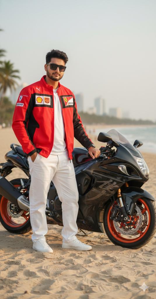 8K ultra-realistic cinematic full-body portrait of a stylish young man standing confidently beside a black 2025 Suzuki Hayabusa with orange alloy wheels, parked on soft sand near a Mumbai beach. One hand is in his pocket, wearing ferrari jacket and white beggy jeans and matte sunglass the other resting casually on the bike’s tank, torso slightly turned 25° left, head tilted 10° downward with a calm, confident gaze. Use my same face 100%