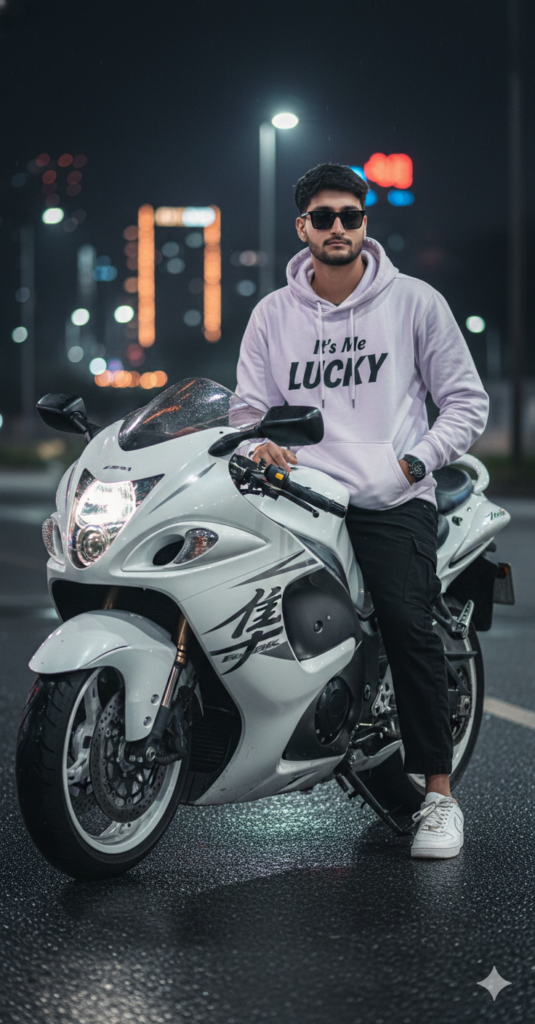 8k ultra-realistic A young boy sitting sideways on a white and white Suzuki Hayabusa superbike at night. Wearing White lavender “It's Me LUCKY” hoodie, black beggy jeans, and Nike sneakers. matte sunglass. Hands in pockets, calm gaze toward camera. Eye-level medium shot, city lights blurred in background, cinematic. Use my same face 100%