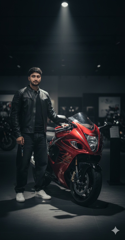 A cinematic dark–theme showroom delivery shot of a brand-new Suzuki Hayabusa in [Red/Black – replace with your exact returning colour here], placed under a dramatic spotlight. The environment around is kept low-light and moody so that the focus stays entirely on the bike and the person. The rider is standing beside the bike while taking delivery, wearing a premium jacket, stylish beggy jeans and Dior sneakers. Use my same face 100%