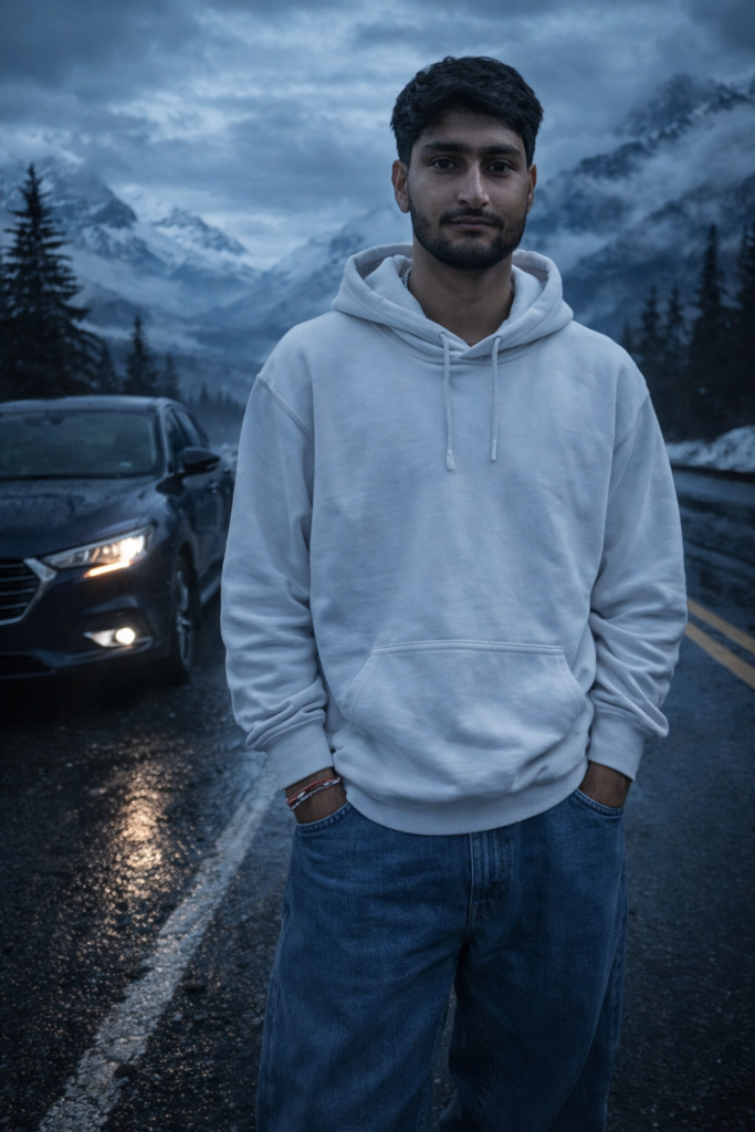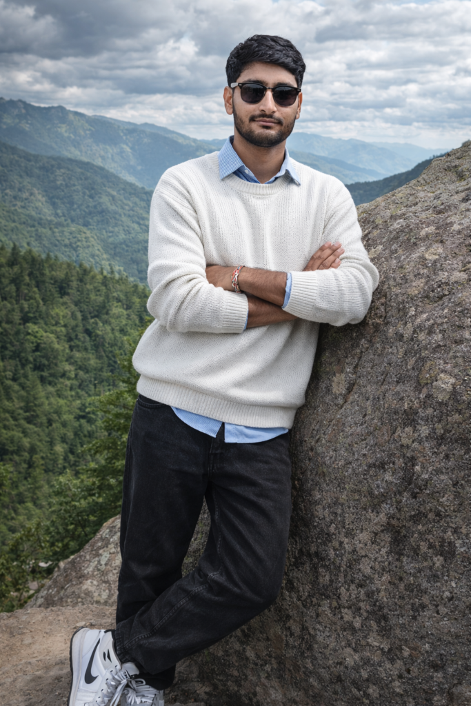 A 9.16 ratio Use my uploaded photo as the face and identity reference. Create a hyper-realistic outdoor portrait where I am standing casually against a large rock at a scenic mountain viewpoint, arms crossed, relaxed and confident expression. I am wearing an white knit sweater layered over a light blue shirt, black beggy denim jeans, and white nike air jorden sneakers. wearing sunglass. Natural posture, realistic body proportions. Background features lush green forested hills, rolling mountains, and a dramatic cloudy sky with soft daylight. And for boy use my same face 100%