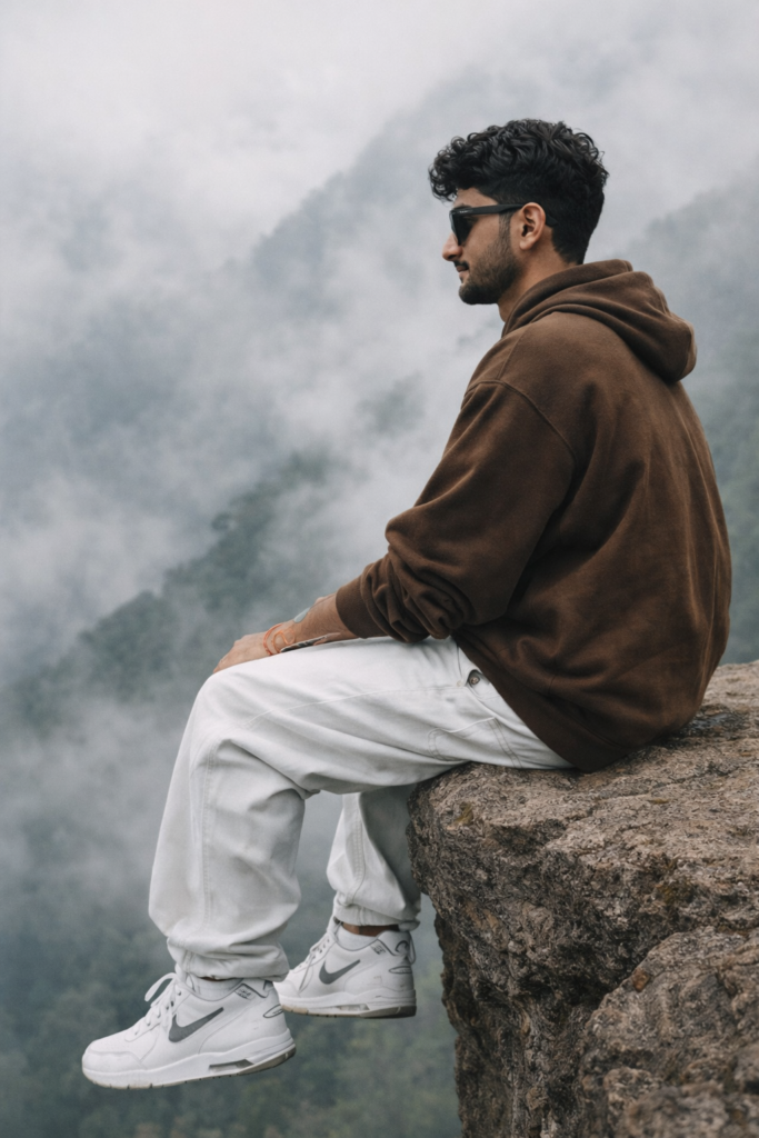 A 9.16 ratio Create a hyper-realistic portrait of a man sitting in a cliff a of rock in mountain,( Used reference photo 100% for Face details) the full shot of a man from the side view, with Wavy Farming massy hair, sitting on the edge of a rocky cliff. He is wearing a brown Oversized Hoodie and white beggy jeans and white air jorden sneakers and wearing black sunglass. A rests on the rock beside him. In the full dence misty background, And for boy use my same face 100%