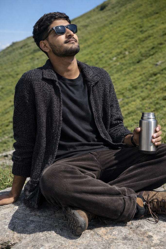A 9.16 ratio Mountain meadow picnic rock — Black and white knit cardigan open over black tee, dark cords, brown hikers. Pose: seated cross-legged on flat rock, thermos in left hand, right hand bracing behind, head tilted toward sun, eyes closed. Light: crisp high-altitude sun with gentle shoulder fill from ground. wearing black matte sunglass. Camera: Pixel 8 Pro • 50 mm (2×) • f/2.0 • 1/2000 s • ISO 60 • AWB 5600 K • HDR+ • RAW+JPEG • spot metering on skin. — man (face reference image uploaded) with green hill behind. And for boy use my same face 100%