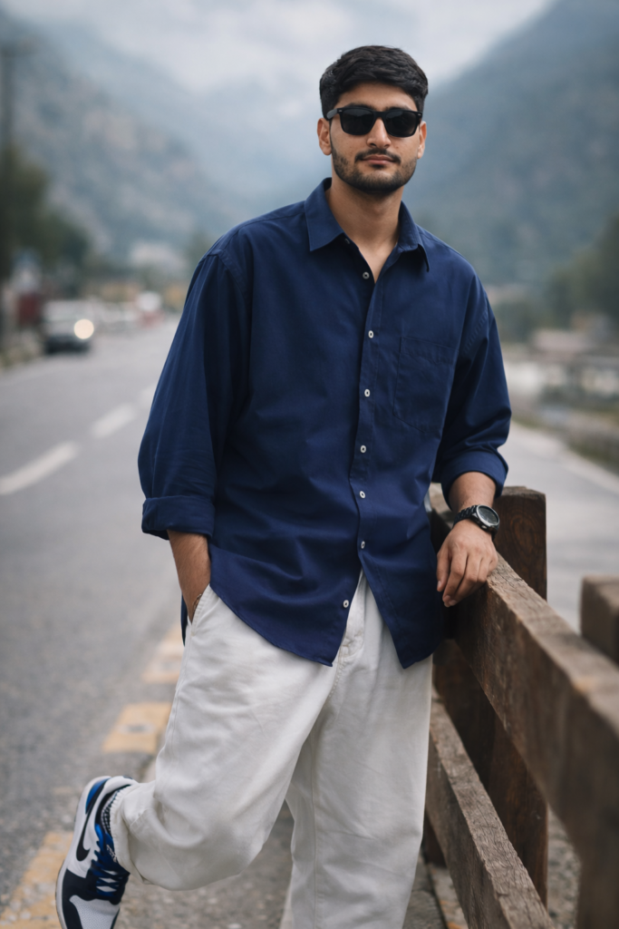 A 9.16 ratio 20-year-old young asian man, well-built, urban fashion editorial. Normal black hair. Oversized dark blue shirt, white denim beggy jeans, nike air jorden shues, watch on left wrist (no breslet or ribbon on other hand). Bold,Instagram influencer vibe, casual pose (standing on the side of the road and leaning on a wooden divider, looking confidently at the camera). Ultra Blurred mountain background, natural light, high contrast, Gen Z aesthetic. Wearing black matte sunglasses. And for boy use my same face 100%