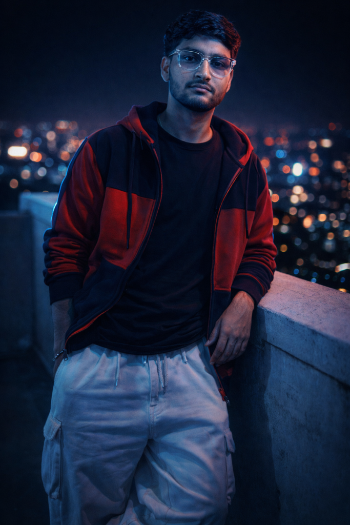 16K ultra-realistic 9.16 cinematic HDR DSLR portrait of a uploaded handsome boy On a silent rooftop at night with glowing city lights, leaning relaxed against a railing/wall.Wearing black tee, red-black hoodie, white beggy jeans, Nike Air Jordan (black/red/white). Wearing transparant clear sunlass, face Cool-blue cinematic lighting with neon highlights, rim-light, deep shadows, natural cinematic tones.DSLR 35mm low-angle wide portrait, shallow DOF, dramatic HDR contrast, ultra-professional Photoshop finish. And for boy use my same face 100%