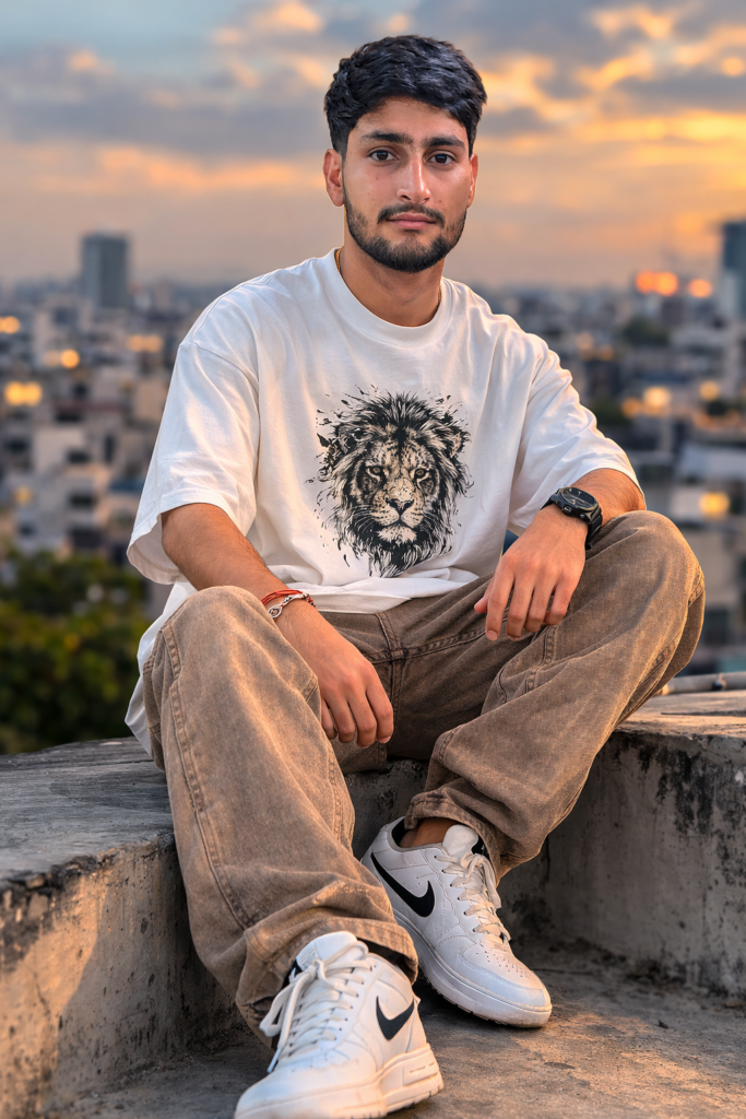Ultra realistic 8k textured Full-body 9.16 portrait of a 22 year old Young man sitting on a rooftop in the late afternoon with a city view background, looking cool and staring at the camera. Stylish hair, Outfit: oversized light brown jeans, oversized white t-shirt with a cool lion design on the chest, and white nike sneakers and wearing black matte sunglass. Camera settings: "f/1.8, 85mm lens, cinematic depth of field" * Artistic styles: "photorealistic," "hyperrealistic," "award-winning photography, And for boy use my same face 100%