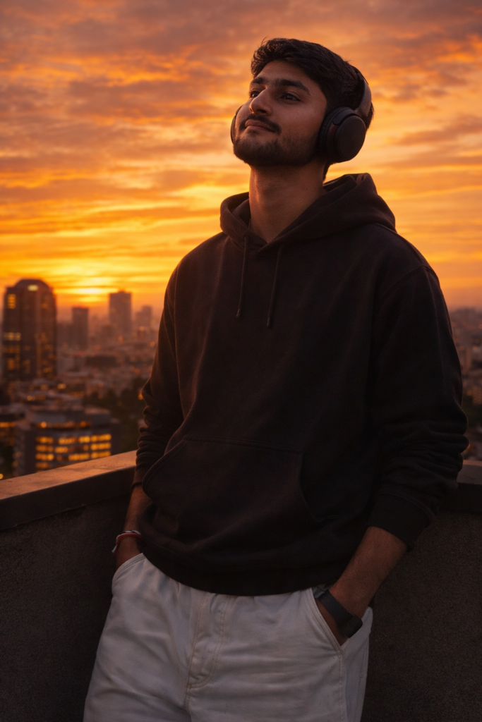 Create A 9.16 ratio portait Without changing his facial features, I edited this photo into a portrait of a young man enjoying music on a rooftop at sunset, his head slightly tilted upwards. He is wearing the clothes shown in the photo black hoodie and white beggy jeans. A golden orange light floods the sky, reflecting off the silhouettes of the city buildings below, creating a peaceful and reflective atmosphere. And for boy use my same face 100%