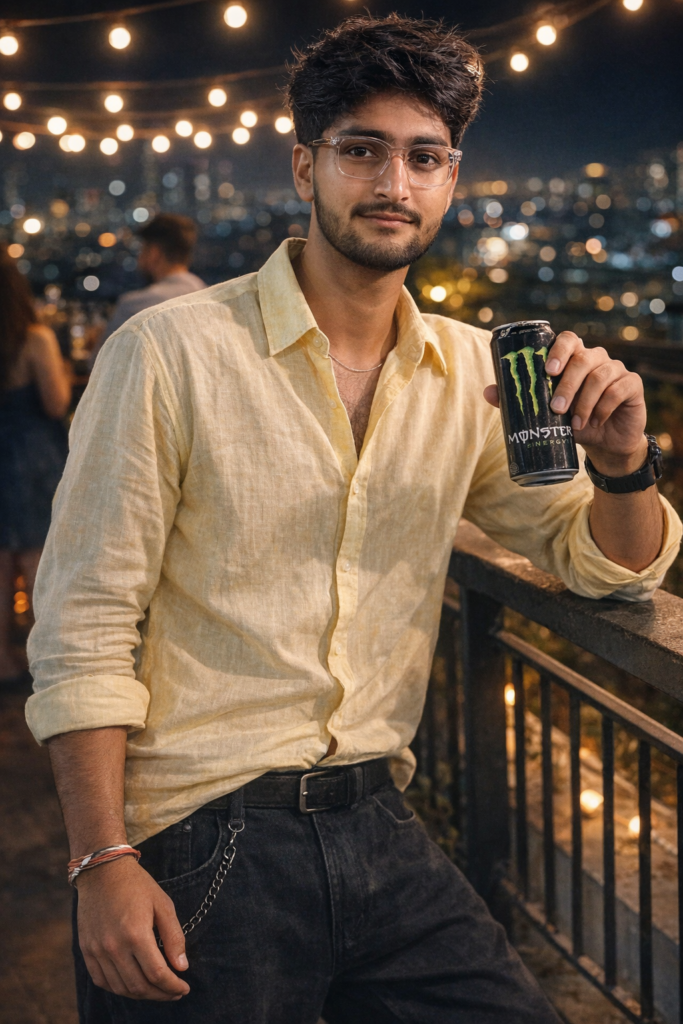 Create A 9.16 portait Nighttime roof-terrace party photo. Subject relaxed, slight side profile but looking at the camera playfully, holding a Redbull can in right hand, left elbow resting on railing. Keep uploaded face exactly the same: same structure, proportions, natural skin texture, slight under-eye shadows, fair glass-skin look. Hair messy with volume/flyaways, no changes to reference. Outfit: yellow linen shirt slightly open at chest, black baggy jeans, wearing clear transparant sunglasss. And for boy use my same face 100%
