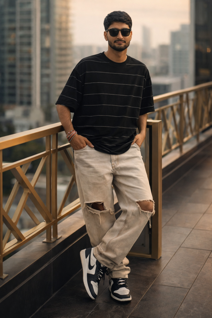Create A 9.16 portait Ultra-realistic cinematic fashion full body portrait of a young man, leaning casually against a gold geometric railing on a modern rooftop. He wears a black (white lines) oversized t-shirt, Biege ripped beggy jeans, black and white Air jorden sneakers. Soft daylight, warm cinematic tones, shallow depth of field, DSLR quality, face 100% same as reference image. wearing black matte sunglasss. And for boy use my same face 100%