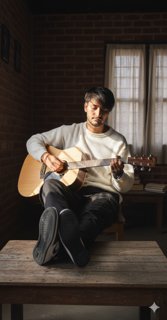 8k Hyper-realistic Diagonal lines of light fall directly on the Young Man’s face, creating a dramatic and emotional contrast. The boy sits alone in a chair, his feet resting on a table, and his hair is messy over the eye, he looks calm and still, as if lost in thought. He is wearing an oversized white woolan sweater, black-colored cargo pants, black and white nike air jorden sneakers, playing guitar . All image elements are presented symmetrically, without Bokeh. Keep it looklike natural phone For boy use my same face 100%