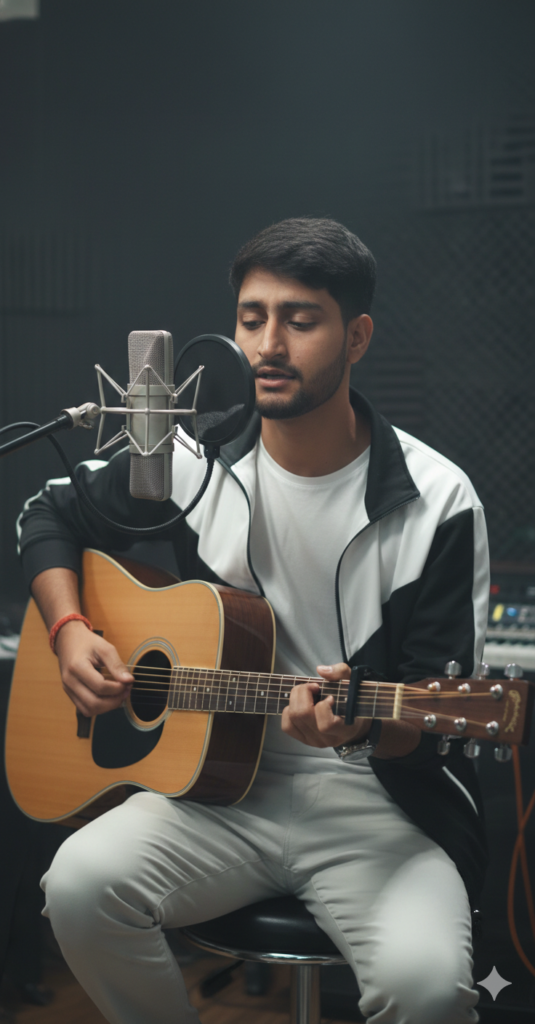 Ultra-realistic portrait of a referenced young man performing live in recording studio , softly lit with dramatic dark background. He is strumming an acoustic guitar and singing passionately into a studio microphone. He is wearing a white and black jacket and white tee and wearing smartwatch in one hand. Subtle studio lights create gentle highlights on his hair and face. Moody, cinematic atmosphere, shallow depth of field, high resolution 8K photography style, soft bokeh in the background, rich contrast and natural colors For boy use my same face 100%