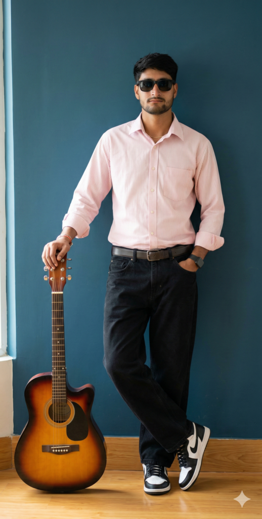A full-body realistic photo of me (use reference image for 100% exact face and hairstyle) standing indoors against a dark teal-blue wall. He is casually leaning on a sunburst acoustic guitar with one hand resting on the guitar's headstock and the other hand keep in pocket. He is wearing a light pink vertical striped shirt, black beggy jeans, and black-white nike air jorden sneakers. His face is clear and wearing matte sunglass, well-lit, and he is looking straight at the camera with a calm expression. The floor is light-colored, polished,.. For boy use my same face 100%