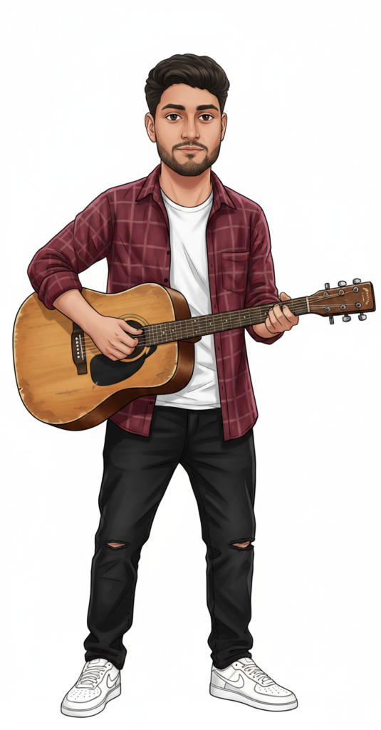 Create a stylized digital caricature illustration of a man (use uploaded photo don't alter the face or appearance ) He is wearing a unbuttoned wine and black plaid shirt, a ripped white shirt and a black baggy jeans and a white nike sneakers. He is playing a sunburst old worn-out acoustic guitar The art style is a clean, detailed vector-style illustration with soft watercolor-like shading on a plain white background. For boy use my same face 100%