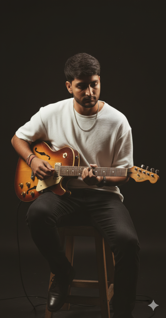 A cinematic portrait of a young men sitting on a stool in a dark studio, holding an electric guitar against his chest. He wears a white woolan t-shirt, dark black jeans, and simple accessories. Soft light highlights his face and guitar, creating a warm, introspective mood with a deep black background. For boy use my same face 100%