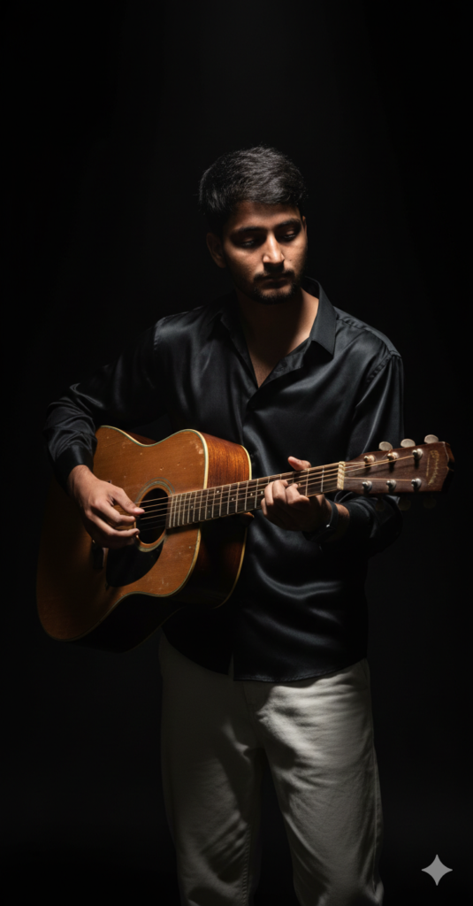 Dramatic portrait of a boy and playing an acoustic guitar inside a black studio Iluminated only by a soft spotlight light from above that highlights part of his face and wooden guitar Dark atmosphere with high contrast lighting creates a mysterious feel focusing on the details of fingers strumming the guitar strings Artistic moody elegant and cinematic atmosphere like an indie musician. Also replace the original clothes with old money type black shirt and white beggy jeans. Poster Realistic For boy use my same face 100%