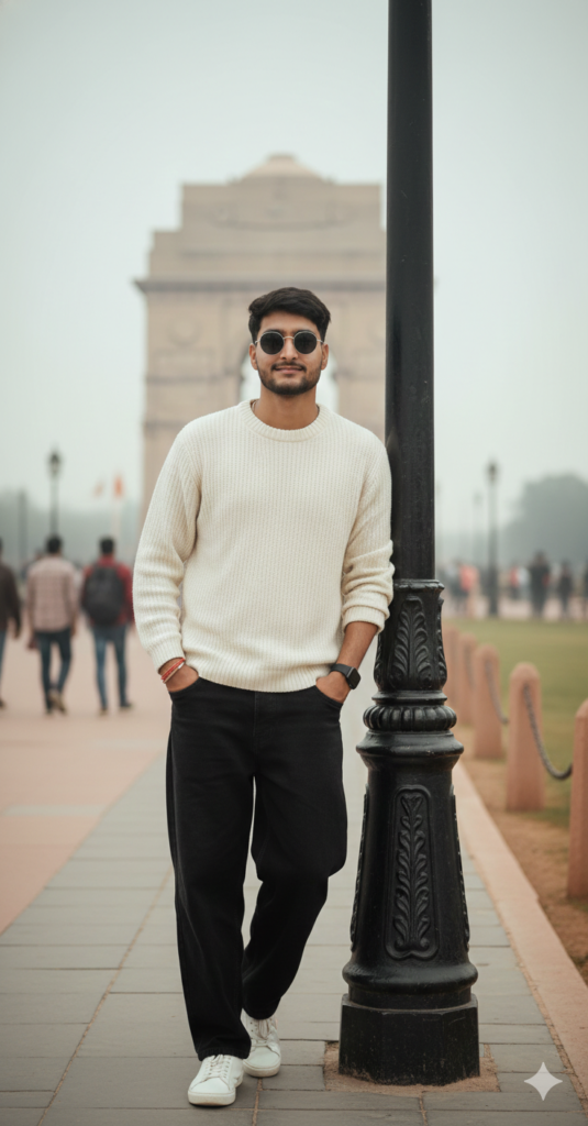 A stylish young man with a beard and dark hair, and waer round sunglass wearing a white sweater and black baggy jeans, with white shoes. leaning casually against a black lamp post on a paved walkway. In the blurred background, the India Gate monument is visible under a hazy sky, with several out-of-focus people walking around. The image has a soft, slightly desaturated quality, conveying a travel or lifestyle aesthetic. Face colour creamy white. Soft gentle smile. Use my same face 100%